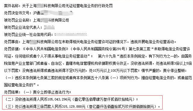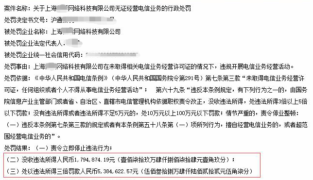 案例二:上海某网络科技有限公司因在未取得相关电信业务经营许可证的情况下,违规开展电信业务经营活动,被上海市通信管理局依据《中华人民共和国电信条例》第七条第三款、第六十九条规定予以处罚。