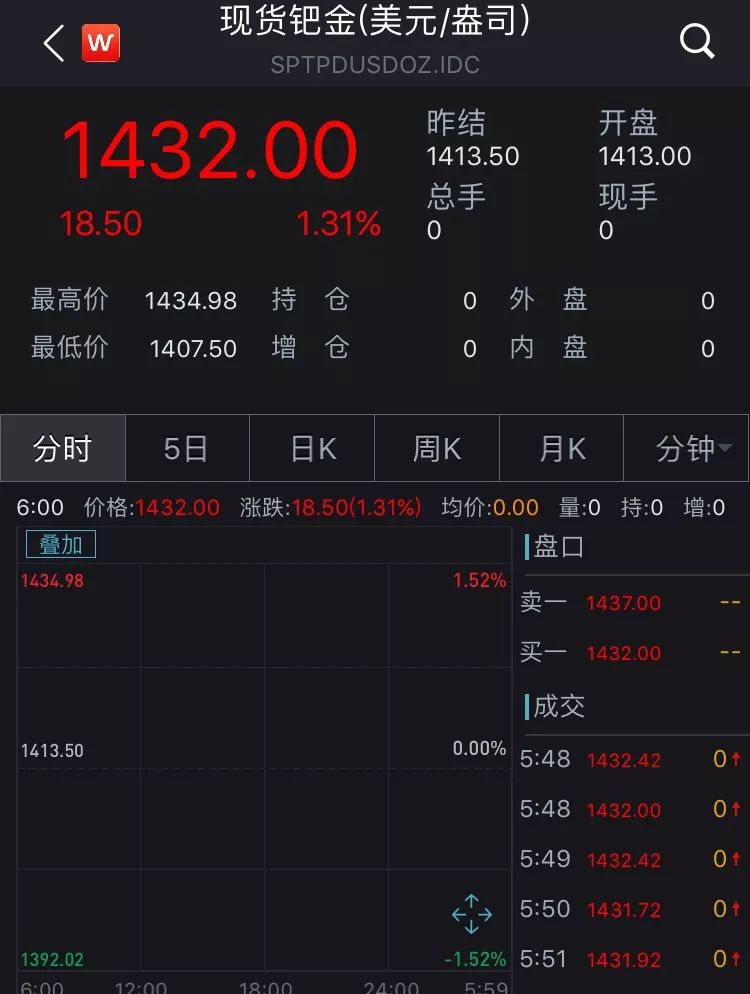 次日,现货钯金上涨1.31%,最新报收1432美元/盎司。钯金期货价格突破1400美元/盎司,再创历史新高。