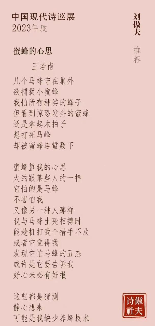 有首歌这样唱——女孩的心思,男孩你别猜,你猜来猜去也猜不明白。那么蜜蜂的心思,就更难猜了。或按照科学理性的说话,是猜不着。但,诗歌和科学不同,祂是感性的,神秘的。有人说,诗歌是通神的艺术。诗人有慧眼,也有天眼,或可以感知万物。
