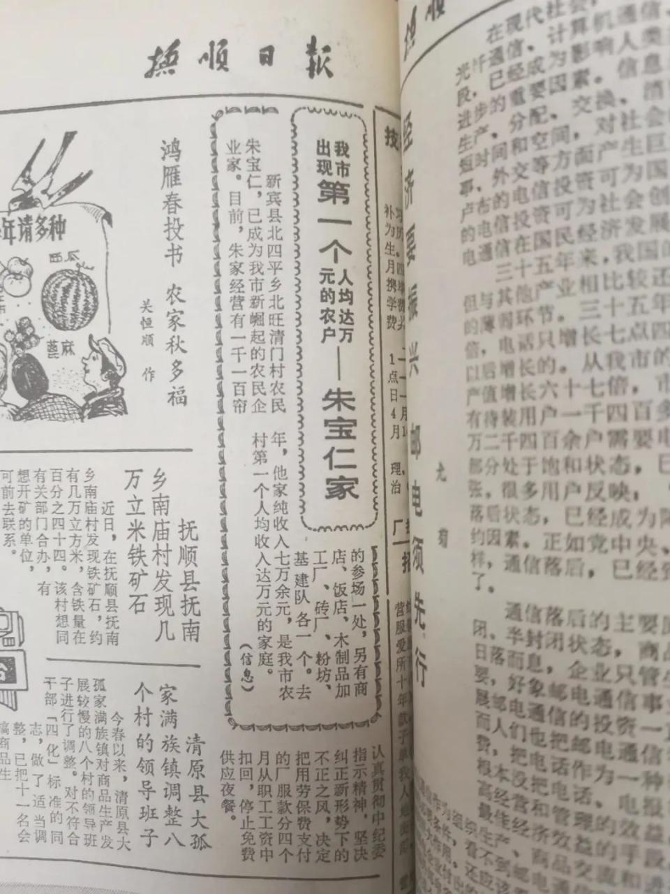 时间到了1985年4月4日,当期的《抚顺日报》2版上刊发了这样一条消息:《我市出现第一个人均收入达万元的农户——朱宝仁家》。新宾满族自治县北四平乡北汪清门村农民朱宝仁,已成为我市新崛起的农民企业家。目前,朱家经营有1100帘的参场一处,另有商店、饭店、木制品加工厂、砖厂、粉坊、基建队各一个。去年,他家纯收入七万多元,是我市农村第一个人均收入达万元的家庭。
