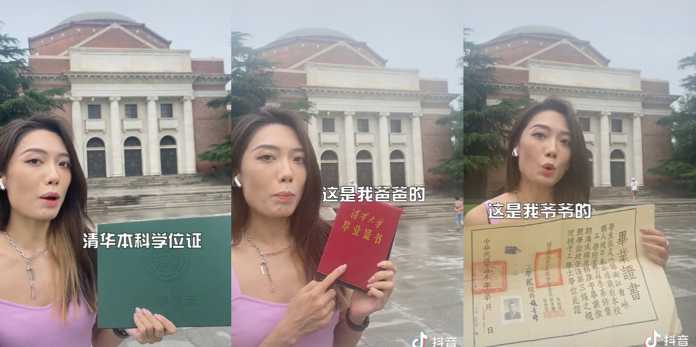 像冤家路窄一般,清华大学也紧随其后,博主 @张笑寒 仿照羊毛月,不仅晒出了自己的毕业证,还晒出了父亲的、祖父的毕业证,以及手边的一位清华在读博士男友。