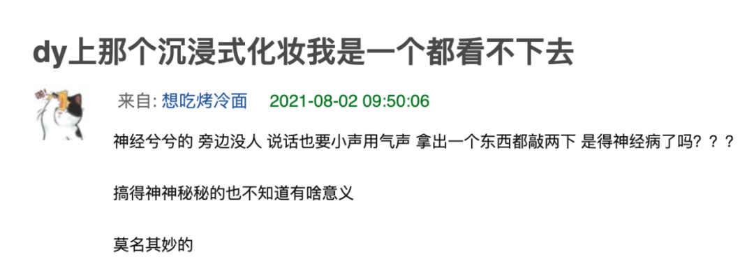 博主们在镜头前专心摆弄脸蛋,没有台词和脚本,只有洗面奶的搓泡泡声、护肤油按压在皮肤上发出的“咕唧”声、以及化妆刷碰撞化妆品发出的“咔咔”的清脆声音。对于好这口的观众来说,无异于免费听了一场维也纳新年音乐会,瓶瓶罐罐碰撞在一起,就像激昂的《拉德斯基进行曲》。