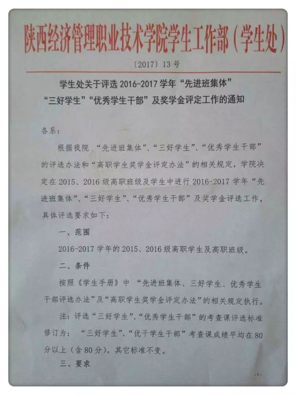 各系:根据陕西省教育厅对全省学生资助工作的要求安排,经研究,学生资助管理办公室决定对我院2016——2017学年国家奖学金进行联评,现将有关事项通知如下:
