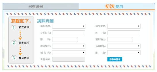 根据右侧文字提示,鼠标放于“初次使用”上,页面自动跳转为注册页面,按照流程进行资料完善。注册完成后,自动登录进系统。