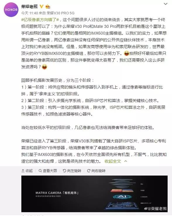 1月13日上午,荣耀老熊又发长文解释了“一亿像素方向错了”这个话题,指出以荣耀的实力,如果想用所谓一亿像素,两亿像素这种没有任何保护的公开供应链伙伴技术,本身技术上对荣耀来说没有瓶颈。