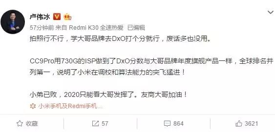 1月14日下午,卢伟冰也在微博上隔空回应,表示“CC9Pro用730G的ISP做到了DxO分数与大哥品牌年度旗舰产品一样,全球排名并列第一,说明了小米在调校和算法能力的突飞猛进!”