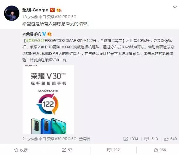 在DXOMark发布荣耀V30 Pro的分数之后,荣耀手机及荣耀总裁赵明也表态了,赵明表示“希望这是所有人都愿意看到的结果。”