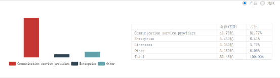 在东方财富网不难查到诺基亚的主营业务构成,以2022年第一季度为例,主要有三大项:电信设备供应占81.77%,企业经营占6.41%,专利授权占5.72%。