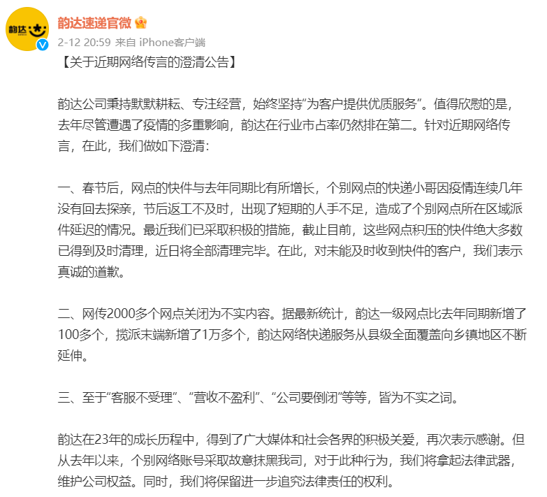 2月,韵达速递官方微博发布《关于近期网络传言的澄清公告》,表示网点由于春节快递小哥返乡积压的快件绝大多数已得到及时清理。公告中称,“网传2000多个网点关闭”“客服不受理”等皆为不实之词。