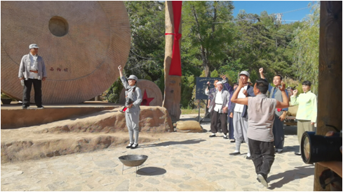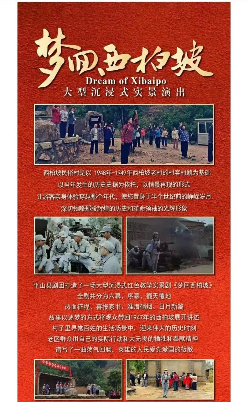 在民俗村,平山县西柏坡镇北庄教育培训中心联袂平山县剧团打造了一场大型沉浸式红色教学实景剧《梦回西柏坡》,全剧共分为六幕:序幕、翻天覆地、热血征程、喜报家书、淮海硝烟、日月新篇,故事以逐梦的方式将观众带回1947年的西柏坡展开讲述,村子里寻常百姓的生活场景中,迎来伟大的历史时刻,老区群众用自己的实际行动和大无畏的牺牲和奉献精神,谱写了一曲荡气回肠,英雄的人民爱党爱国的赞歌。
