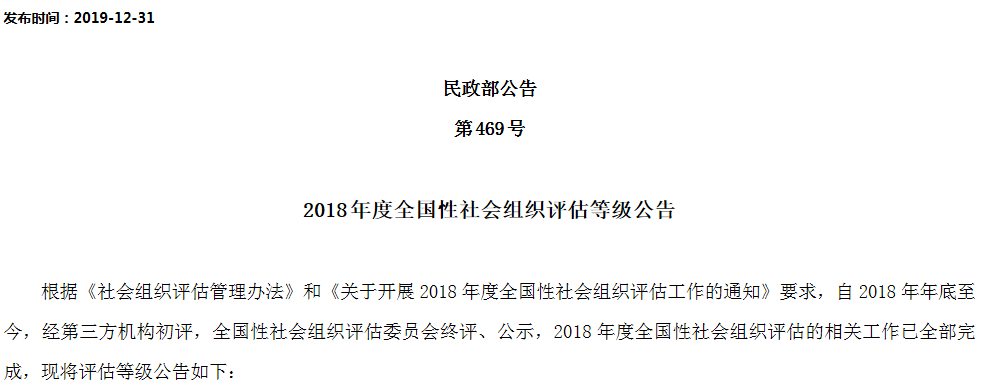 2019年12月31日,民政部发布2018年度全国性社会组织评估等级公告(民政部公告[第469号])。至此,经第三方机构初评,全国性社会组织评估委员会终评、公示,2018年度全国性社会组织评估的相关工作已全部完成,其中基金会:5A级5家,4A级22家,3A级21家,2A级8家。首次参评的东润公益基金会获评为国家级4A基金会,体现了民政部及社会各界对东润公益基金会工作成效的充分肯定。