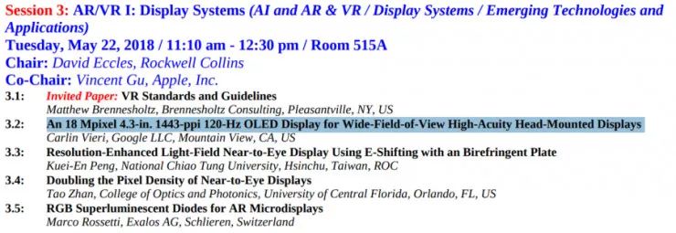 同时,雷锋网发现大会的专题会议上给出的标题为:“18 Mpixel 4.3-in. 1443-ppi 120-Hz OLED Display for Wide-Field-of-View High-Acuity Head-Mounted Displays“(1800 万像素、4.3 英寸、120 Hz OLED d显示屏,专为大视角、无延迟头戴显示器打造)。从中我们可获知该屏幕的一些具体参数,如刷新率为 120 Hz,尺寸 4.3 英寸。