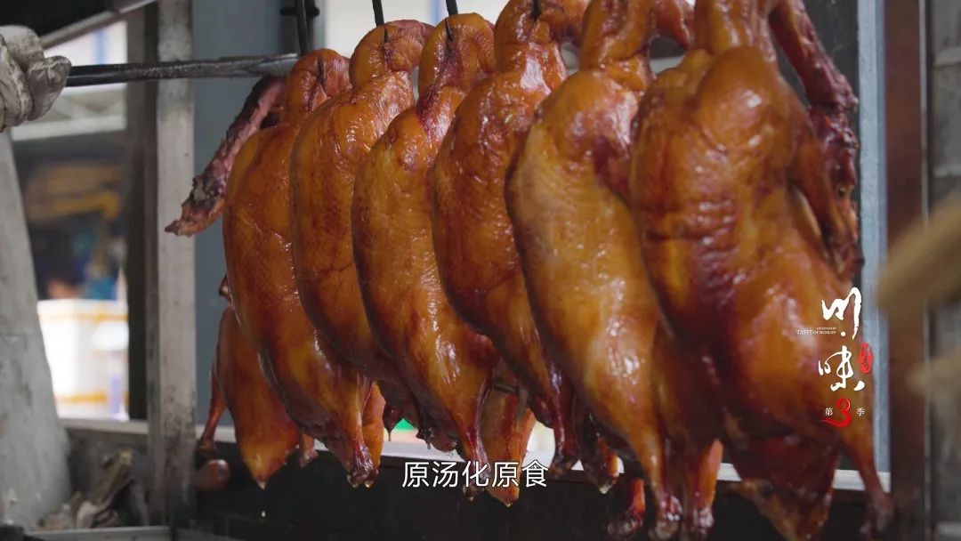 接下来可是制作甜皮鸭的关键步骤,用红糖、蜂蜜、姜糖调制的糖浆被均匀地抹在鸭皮上,焦脆的表皮吸收了甜味,完成了最后的蜕变。