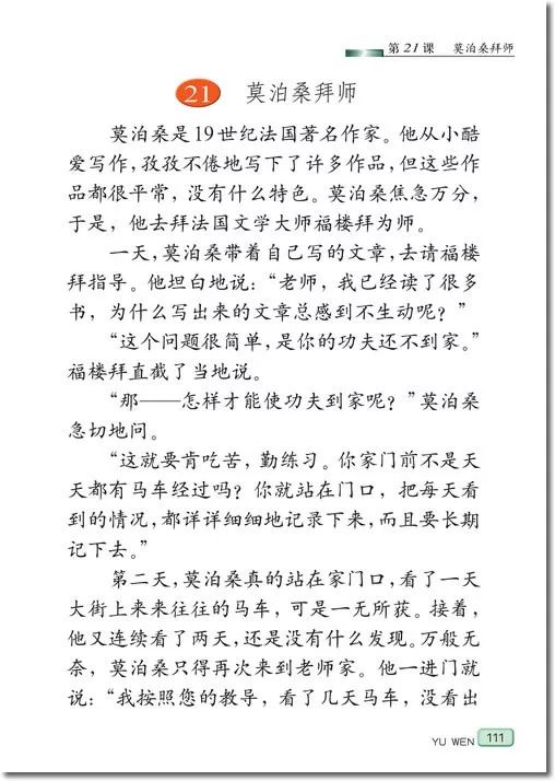 天才在于积累,聪明在于勤奋。莫泊桑用他的刻苦、勤奋为自己成为著名作家铺就了一条金光大道。课文叙述了法国作家莫泊桑年轻时请福楼拜指导写作,在老师的细心指导下,他仔细观察,用心揣摩,积累了许多素材,写出了不少有世界影响的名著。