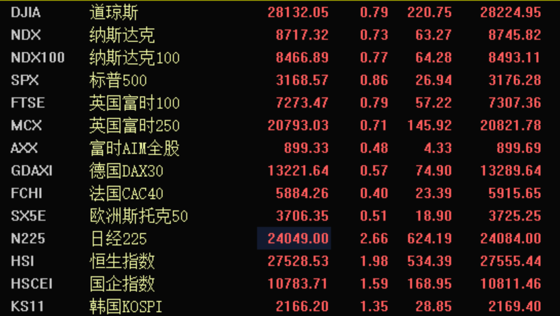 欧洲主要股市英国富时100指数涨0.79%、德国DAX 30指数涨0.57%、法国CAC 40指数涨0.40%。亚洲日韩股市创近一年新高,今早港股恒生指数大幅高开近2%。