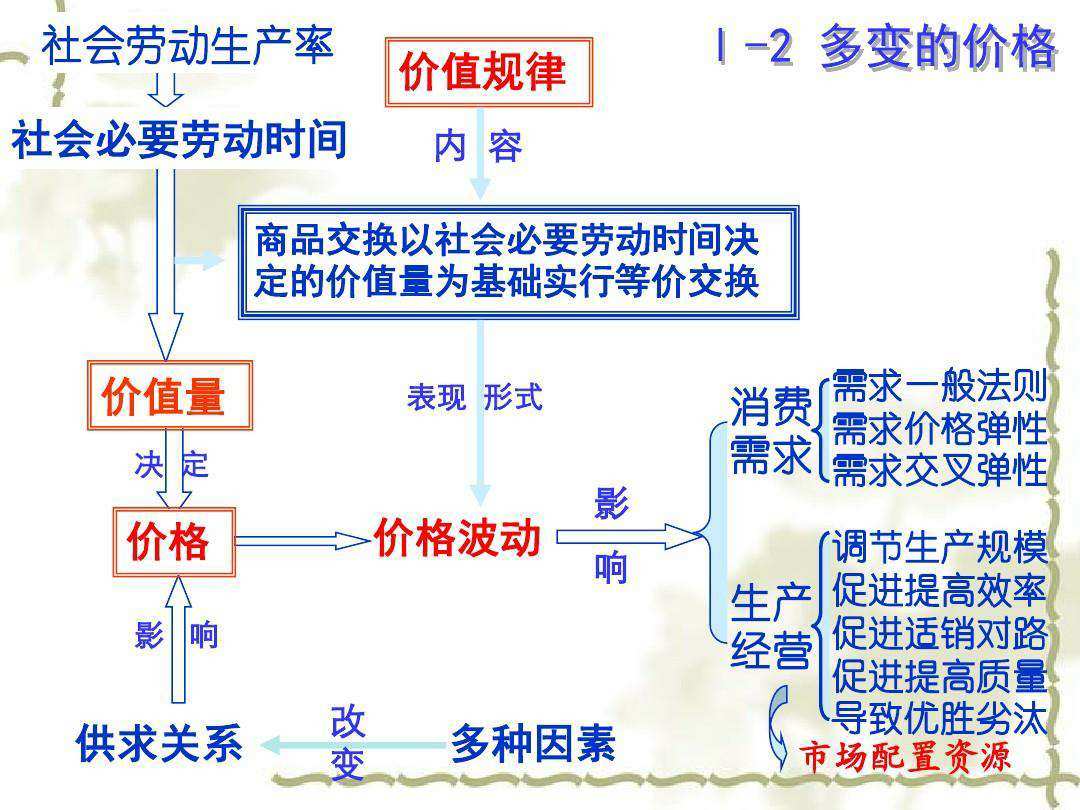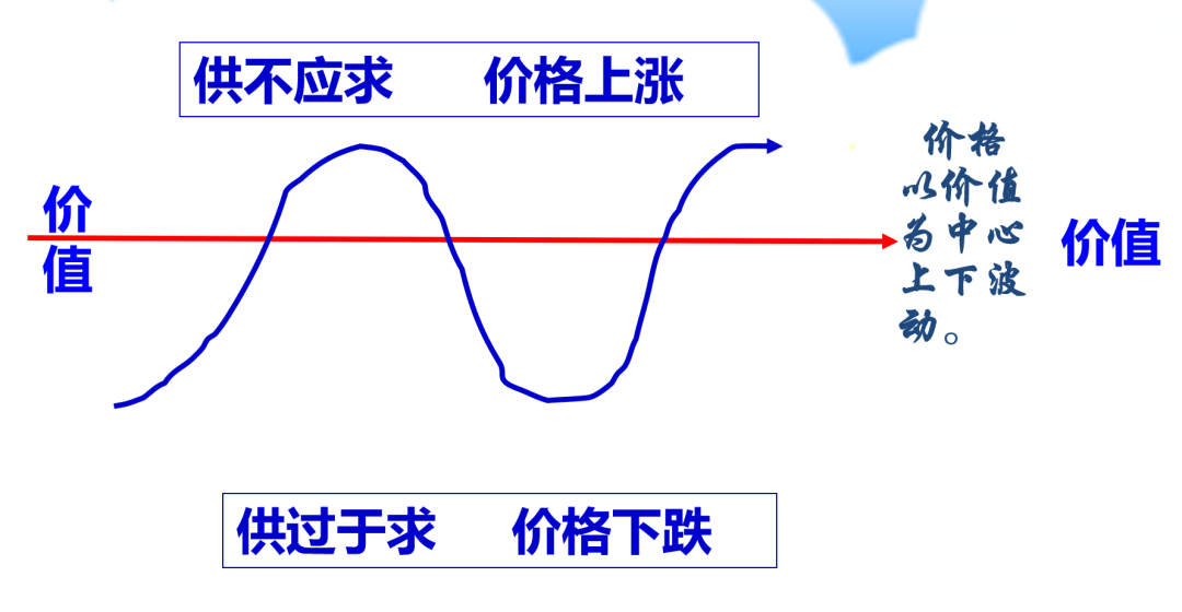 由于受到供求关系变动的影响,商品价格总是不断波动商品经济的基本规律,时而高于价值,时而低于价值,不停地围绕着价值这个中心上下波动。从较长时间来看,价格高于价值的部分和价格低于价值的部分能够相抵,商品的平均价格和价值是相一致的。