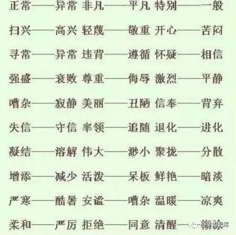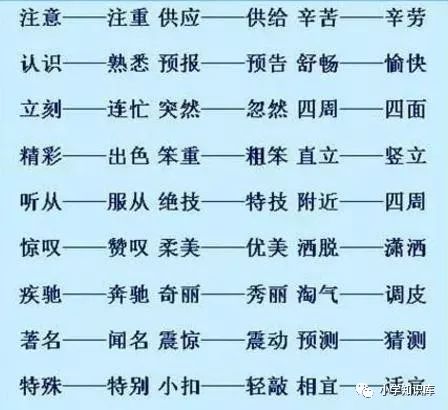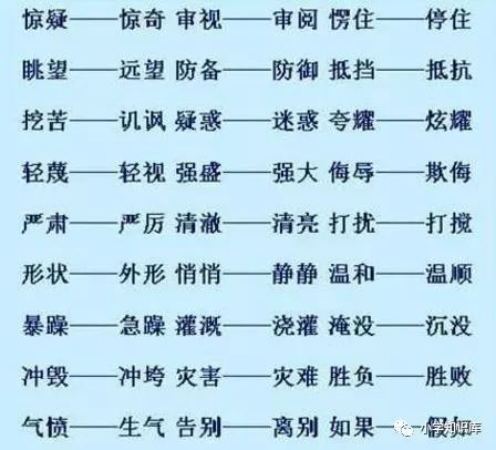 鉴于此,下面这份资料整理了1000个近义词和反义词核心同义词,建议有需要的家长替孩子收藏、打印(有电子版)。打印出来放在孩子能经常看到的地方,有事没事都多看看、背背核心同义词,时间久了就能攒下许多词语,词汇量自然就上去了,今后写作文时也不愁找不到形容词,而满篇“口水话”了。