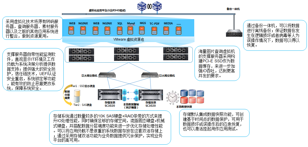 可视化平台采用了6台4路戴尔服务器支持平台的网站搭建和转码服务。服务器采用3U4路架构,节省空间,并且能提供强劲的计算性能;配置Nvme硬盘,提升了虚拟机以及数据库的IO速度;通过一对多系统管理控制台提供中央访问点,管理员全面掌握整个平台环境的运行状况,进而实现对平台的高效监控和管理。