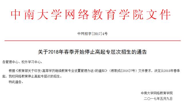 根据教育部《高等学历继续教育专业设置管理办法》,2017年起,普通高校不再设置成人高等教育专科专业中南大学网络远程教育官网,不再招生成人教育专科层次的学生。各大高校陆续发布公告,将在2018年全面停止各种成人学历招生,第一波是211、985高校,第二波就是各省一本二本院校!