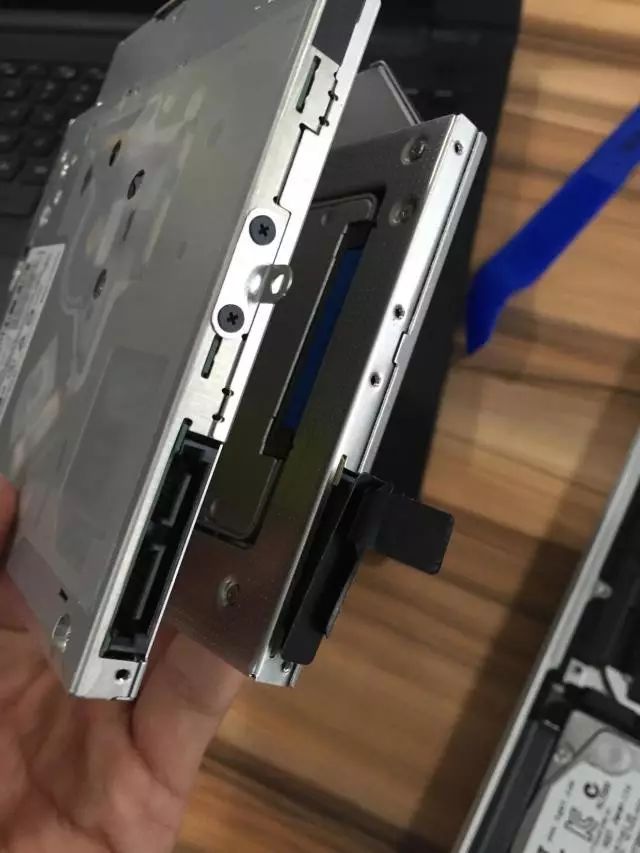 这里光驱就完全拆下来了,需要注意别忘记把光驱上的数据线和一个固定扣拆下来装到硬盘架上。