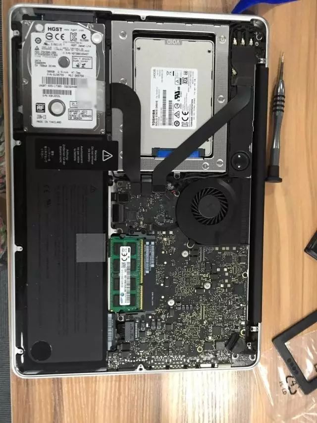 这里开始拆机, 笔者从小喜欢把各种电器手机等拆开研究一下内部结构再装好, 这里当然也毫无压力, 不过需要注意几点,在网上看教程,都说只需要一把十字头螺丝刀就搞定, 但是笔者这台 Macbook Pro背后的螺丝居然形状是不同的,虽然同样的大小,但拆除后盖你至少需要2把螺丝刀,还有几颗是内六角的,这也算是严密方式的一种吧。