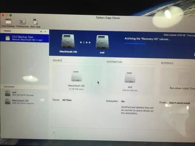 进入系统之后,首先需要打开「应用程序——实用工具——磁盘工具」,大家也可以按 control+空格键,然后搜索磁盘工具启动。然后在磁盘工具界面左侧选择你的 SSD 固态硬盘, 将硬盘格式化。 然后需要下载Carbon Copy Cloner 软件来实现转移数据,这个软件相当好用。 因为笔者电脑刚刚格式化过, 所以除了系统没有什么数据要转移, 实际用时只有十分钟。 大家也可以选择自己需要的文件进行数据转移。
