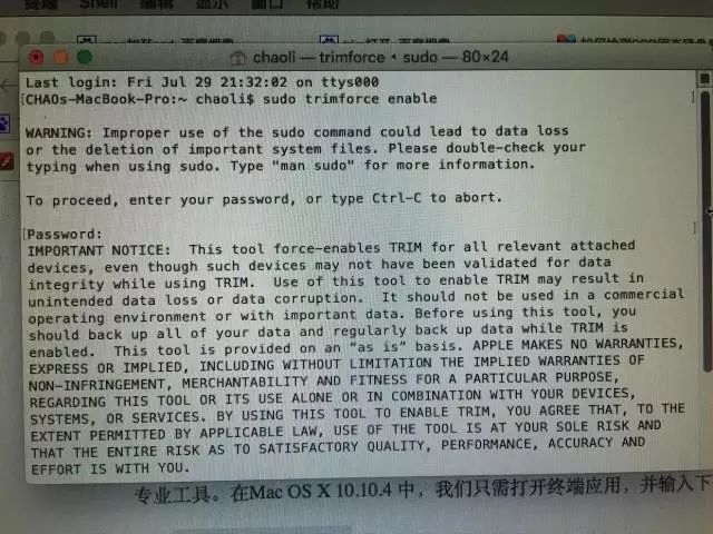 复制该行代码,完成输入后,需要输入密码,然后输入 y(yes)并回车。系统会自动重启,重启完成后,TRIM支持已经开启。 怎么样,简单吧。