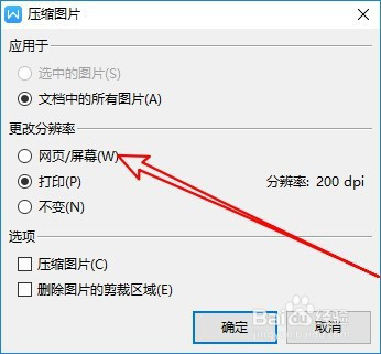 2、在弹出“压缩图片”窗口时,你可以根据实际需要来指定是压缩文档中所选定的图片还是压缩文档中所有的图片,将“压缩图片”复选框勾选,然后点击“确定”按钮即可。
