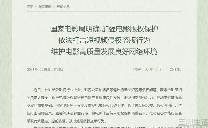 4 月 9 日,50 余家影视公司、五大长视频平台及影视行业协会发出联合声明,共同呼吁广大短视频平台和公众账号生产运营者尊重原创、保护版权,未经授权不得对相关影视作品实施剪辑、切条、搬运、传播等侵权行为。