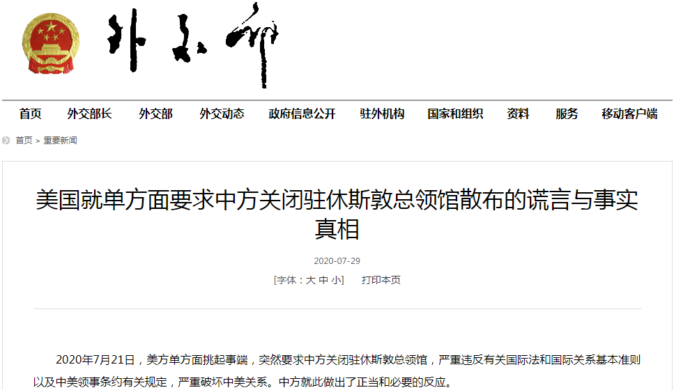 7月29日凌晨,外交部网站发布重要新闻,阐述了“美国就单方面要求中方关闭驻休斯敦总领馆散布的谎言与事实真相”。全文如下: