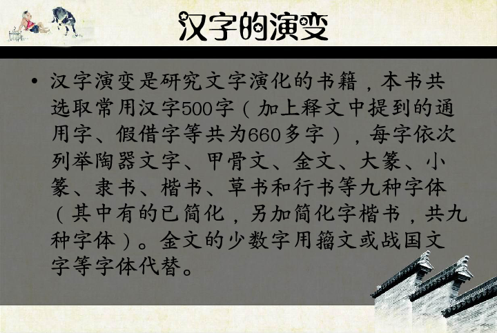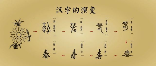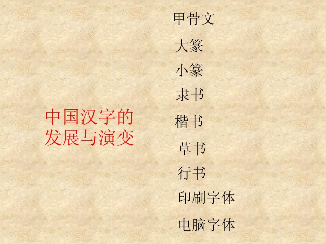 汉字发展至今大致有甲骨文、金文、大篆、小篆、隶书、草书、楷书、行书、宋体几个阶段。甲骨文又称“殷契”“殷墟文字”,主要指殷墟甲骨文,是在公元前14世纪的殷商时代刻在龟甲兽骨上的文字。金文大概出现于商周时代,是一种刻在青铜器上的文字,应用于商代的早期至秦灭六国期间汉字的演变过程50字,大约有一千两百年的历史。