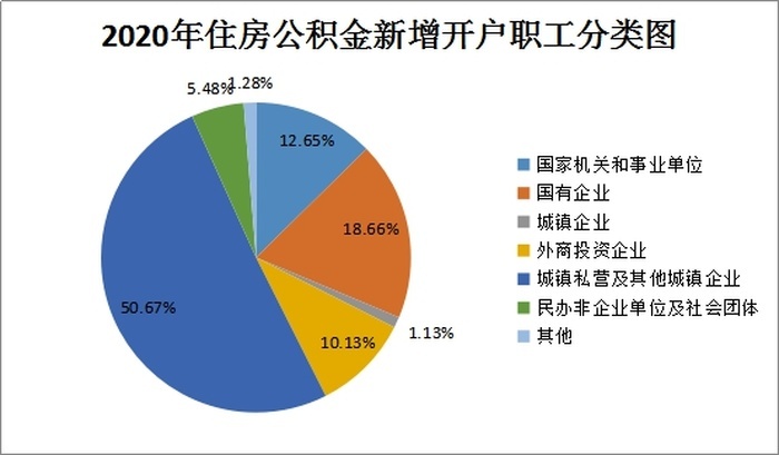 缴存职工中,国家机关和事业单位占66.33%,国有企业占14.36%,城镇集体企业占8.11%,外商投资企业占0.55%,城镇私营企业及其他城镇企业占8.71%,民办非企业单位和社会团体占1.30%,灵活就业人员(含个体工商户)占0.06%,其他占0.58%;中、低收入占98.38%,高收入占1.62%。