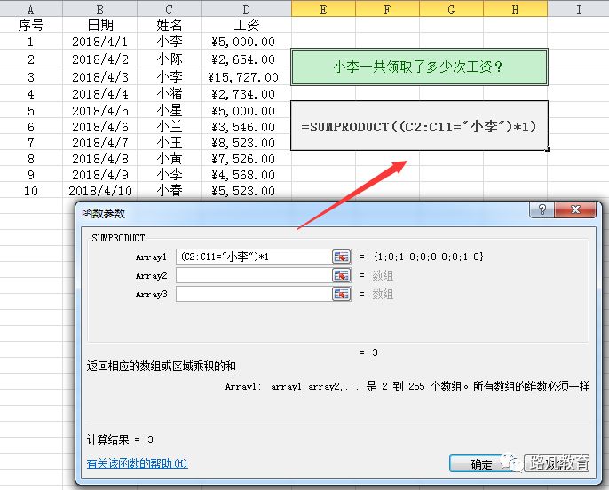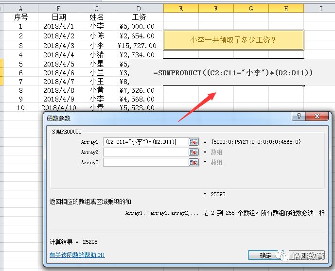 参数含义:选中“姓名”列作为数据组,等于“小李”的才计算;用*连接两个数组,再选中“工资”列作为求和范围。