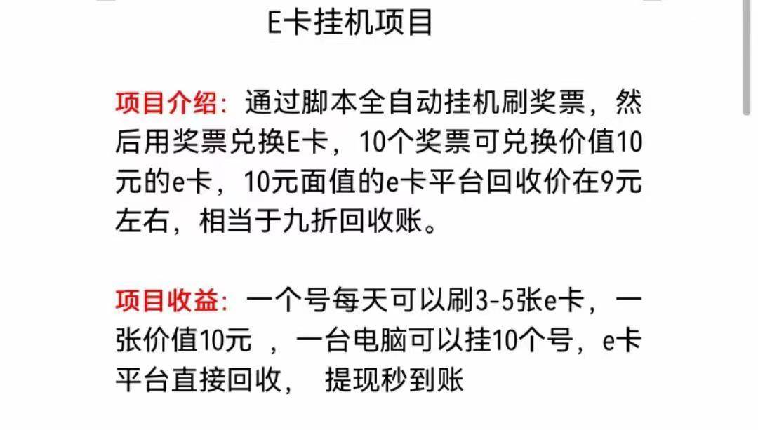 一个号每天产出3-5张E卡,一张价值10元,一台电脑可挂10个号,提现秒到账