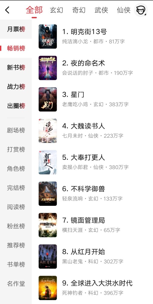 第四名《大奉打更人》,最近几个月上线的热门新书。悬疑仙侠文,但卖报小郎君写得偏欢乐向,在读者间的人气非常高。