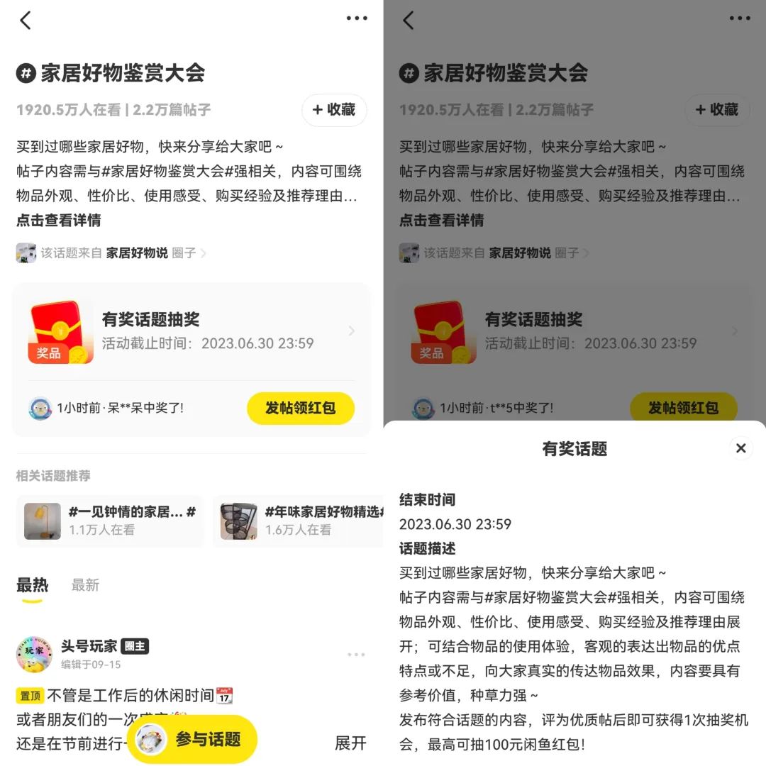 在闲鱼上找到刚才的帖子入口,直接把文案图片贴上去。发帖时一定要选好圈子和话题,否则没有奖励,而且发帖容易通过,通过了还可以抽奖。