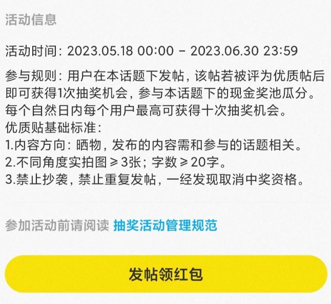 2.点击帖子进入,可以看到抽奖主题入口,查询相关规则,发帖直到帖子被评为优质帖子,即可获得抽奖资格。开奖金额从几毛钱到100元不等,一个账户每天最多有十次抽奖机会。运气好的话,还有机会抽到100元红包。一个账户一天几十元也很轻松。