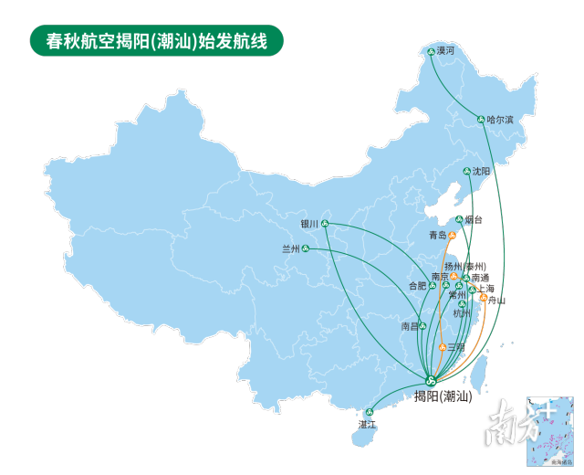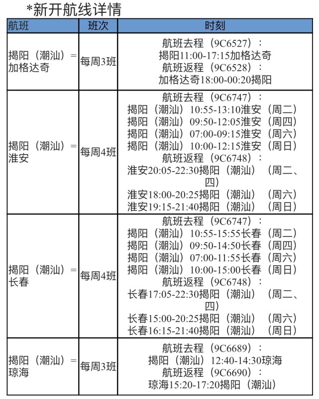 揭阳潮汕机场运输生产快速发展,航线网络结构和布局也日趋优化完善。目前,揭阳潮汕机场定期运营的航空公司有21家,定期执行航线71条,其中国内航线63条,国际及地区航线8条,定期通航境内外城市58个,每日进出港航班数量平均超过155架次,基本形成覆盖国内重点省会、二线及热点旅游城市的航线网络结构;机场不断加密现有的空中骨干航线,目前上海平均每天出发9班,长沙、贵阳、郑州平均每天出发5班,杭州、重庆平均每天出发4班,较大程度满足广大旅客商务、旅游等不同的出行需求。与此同时,揭阳潮汕机场发挥区位及市场优势,努力拓展东南亚地区航空市场。今年冬航季开始,潮汕机场携手澜湄、天空吴哥航空新增暹粒=揭阳、西哈努克港=揭阳两条国际定期航线,近期还对西哈努克港=揭阳航线进行了加密,加上已开通的曼谷、吉隆坡、金边、新加坡等东南亚航线,实现航线辐射范围更广,通达性更强揭阳潮汕机场,潮汕机场打造“连接东南亚航空中转枢纽”战略初见成效。