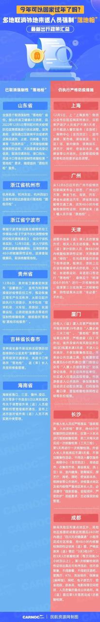 连日来,全国多地相继发布疫情防控优化调整措施,涉及核酸检测、就医买药、乘坐公共交通工具、进入公共场所等多个领域。而在针对外地来返人员的管控措施方面,已有多地进一步放宽,宣布取消强制性“落地检”。