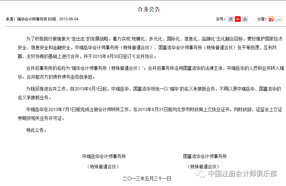2013年5月31日国富浩华,中瑞岳华会计师事务所(特殊普通合伙)和国富浩华会计师事务所(特殊普通合伙) 发布合并公告,合并后名称为“瑞华会计师事务所(特殊普通合伙)”;合并后事务所沿用国富浩华的法律主体,中瑞岳华的人员和业务转入瑞华。合并前双方的债权债务由各自承担。