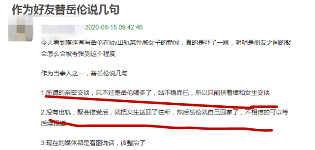 基本上众说纷纭吧,在王岳伦正式回应之前,网上还有一位自称是他好友的人出来抱不平,号称自己当时也在场,王岳伦只是喝多了站不稳而已,所以只能扶着墙和女生交谈。