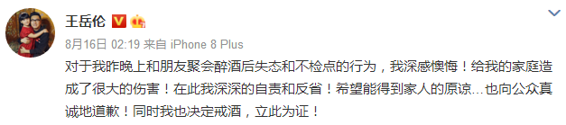后来王岳伦自己的回应也说这是“酒后失态”,他深感懊悔自己不检点的行为,也知道自己给家人造成了很大的伤害,所以深深的自责和反省,希望能得到家人的原谅,也向公众致歉。