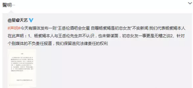 王岳伦本人也出面澄清,表示照片是上个月的旧照,他当时在和工作人员一起参加庆功宴,在场所有人里没有杨紫嫣,他不认识对方,也没有自曝初恋女友,在场的人都可以帮他作证,清者自清。