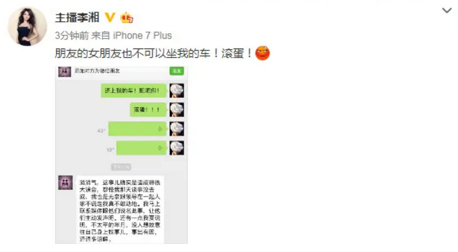 李湘也出面帮王岳伦澄清,她在微博上晒了自己质问这位“朋友”,以及对方向她道歉的截图,配文“朋友的女朋友也不可以坐我的车!滚蛋!”,一方面表达自己的愤怒,一方面也帮王岳伦证明了,那的确是“朋友的女友”。