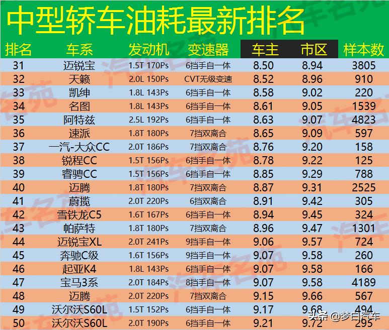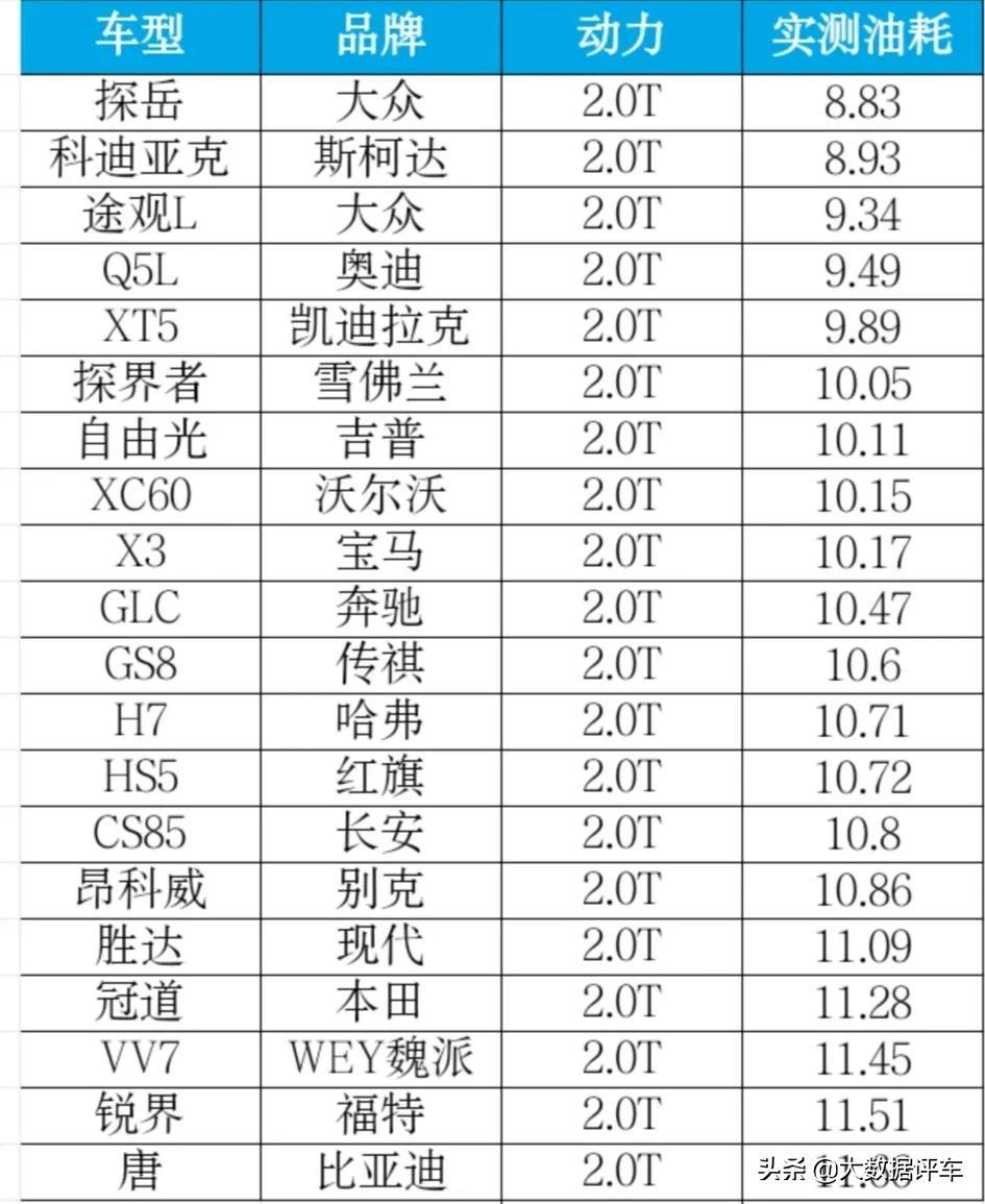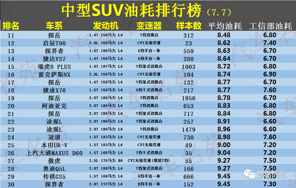 4、最后是排名靠后的17款中型SUV,它们都是大功率车型,而除了昂科威、本田冠道、哈弗H7和福特撼路者之外,丰田汉兰达、现代胜达、福特锐界、WEY VV7、长安UNI-T、比亚迪唐以及日产途达等车型,都是新上榜的车型,它们的平均油耗都超过了11个油,这么高的油耗还真让人有点头疼。