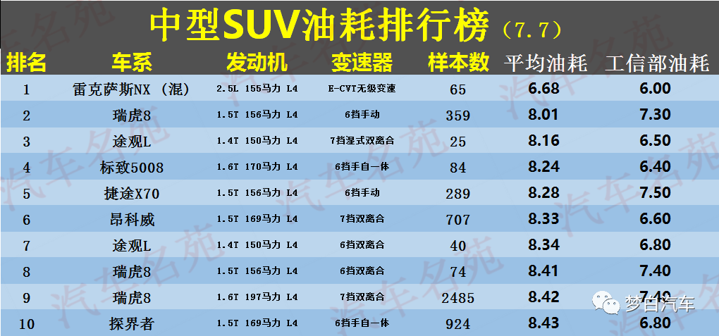 3、而日产楼兰、凯迪拉克XT5和大指挥官等二线合资SUV,它们的油耗表现都相对一般,平均油耗都超过了9.5个油,而豪华车型奥迪Q5L、宝马X3、沃尔沃XC60、奔驰GLC以及红旗HS5等车型,其油耗表现也很一般混动suv汽车排行榜前十名,红旗HS5和奔驰GLC的平均油耗更是超过了10.5个油。国产车豪越、风光580和哈弗H7也都是榜上有名,不过它们的平均油耗都在10个油以上。