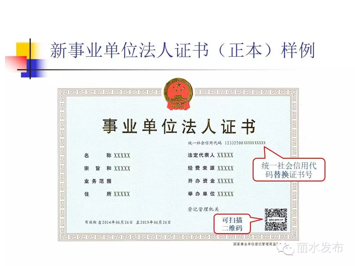2016年1月1日起,根据国家、省的统一部署,我市事业单位法人正式启用统一社会信用代码,登记管理机关设立登记、变更登记、证书补(换)领时,一律使用新版《事业单位法人证书》,实现三证(事业单位法人证、组织机构代码证、税务登记证)合一、一证一码,质监、税务部门不再另行赋码。