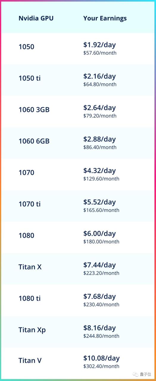官方网站上针对各种GPU给出了一个清晰的价目表:赚得最少的老GPU 1050,每天1.92美元;Titan V赚的最多,每天10.08美元。