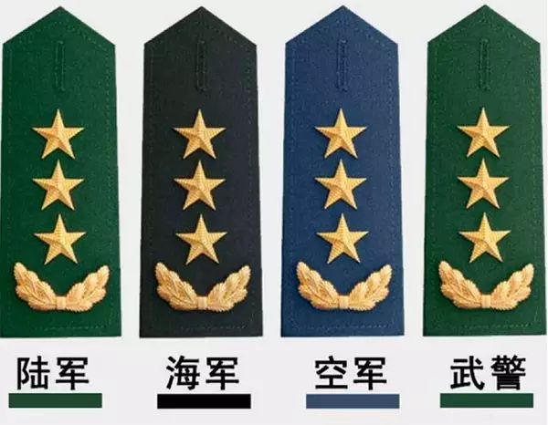 解放军的军衔共分5等19级,上将为最高军衔,图案为金色枝叶加三颗金星。