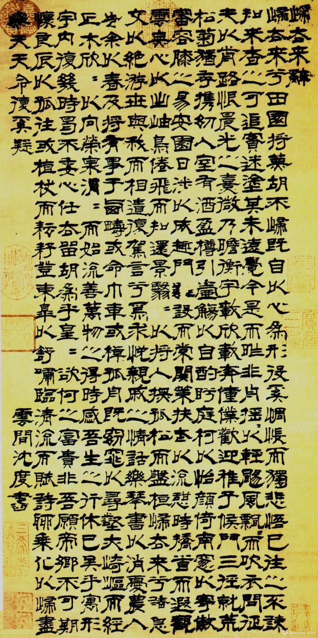 八大山人书画上可以看到各种印文、印章,刀法、字体、形状各不相同。各种印章在八大不同时期作品中依次出现。可通过印章区分作品创作年代。见到最多的应该是“八大山人”这四个字。今人解读为仙人、哭之笑之。也有认为八是宁王八代孙,大为皇族贵胄耷,山人则亡命山野。似乎各有各理,真意可能只有历史那头蜷缩身体,金鸡独立,白眼看世的八大自己明白。